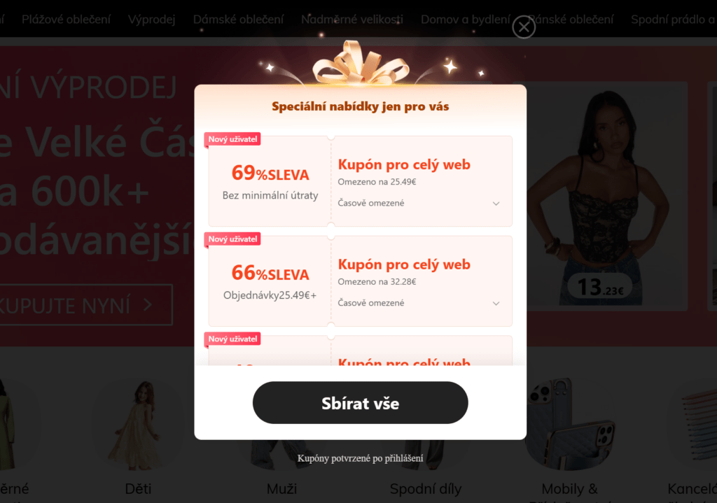 - minihry a soutěže – na webu Shein nebo v mobilní aplikaci se často objevují minihry, za jejichž splnění lze získat slevy nebo kredit na nákup.